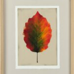 Lámina giclée con motivo de hojas secas, impresa sobre papel gofrado de 315gr, cortada a mano, enmarcada con una moldura en forma de cuña chapada en roble natural y un paspartú libre de ácidos.