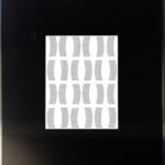 Lámina giclée sobre papel gofrado reproduciendo motivos geométricos enmarcada con un gran passepartout negro libre de ácido y un perfil de aluminio brillante.