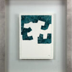 Cuadro de lámina giclée en papel gofrado cortado enmarcado entre dos cristales (se ve la pared a través) y una moldura gris piedra.